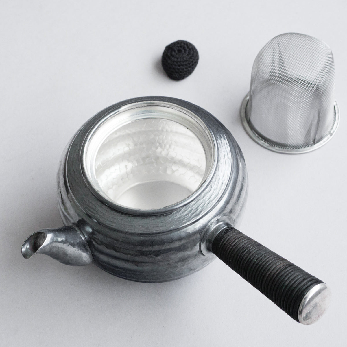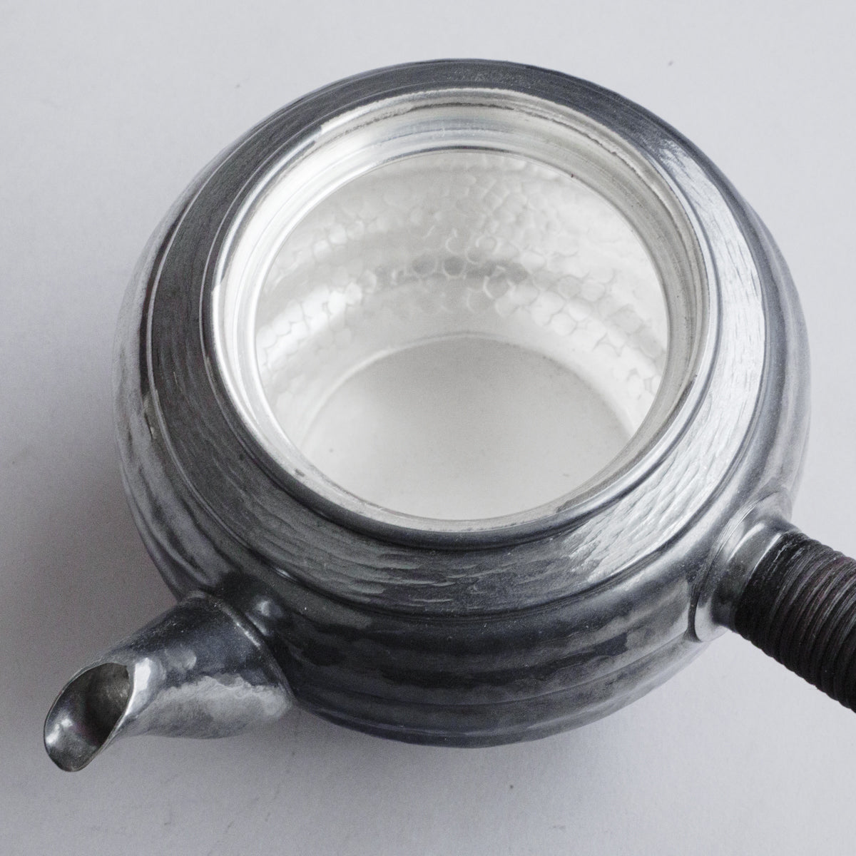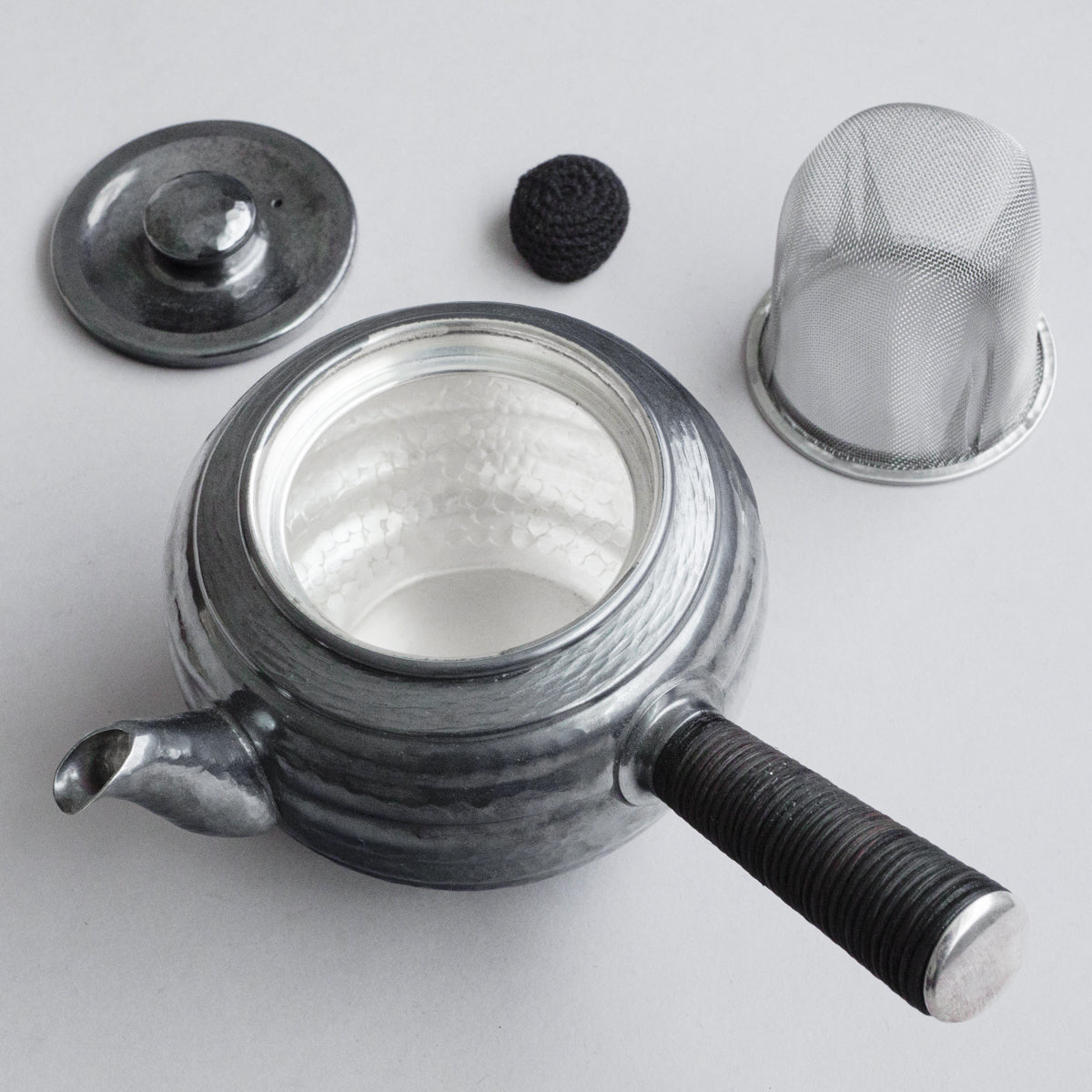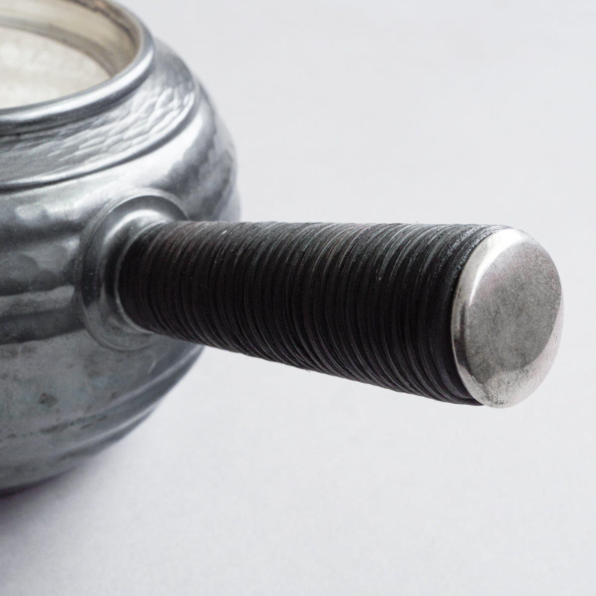 こちらは真鍮製の急須で銀メッキが施されているものです。持ち手は熱くならないように蔓を巻き付けております。装着可能な金属の茶こしアミも付属。丹精に数千回も叩き描いた槌目模様は美しさだけではなく、本体の強度を増す役割も果たしています。