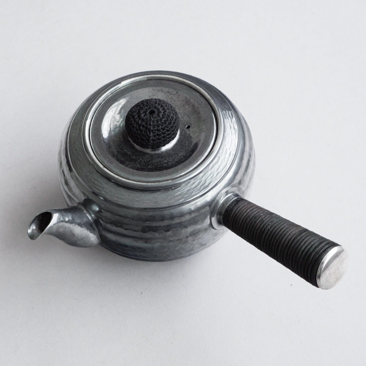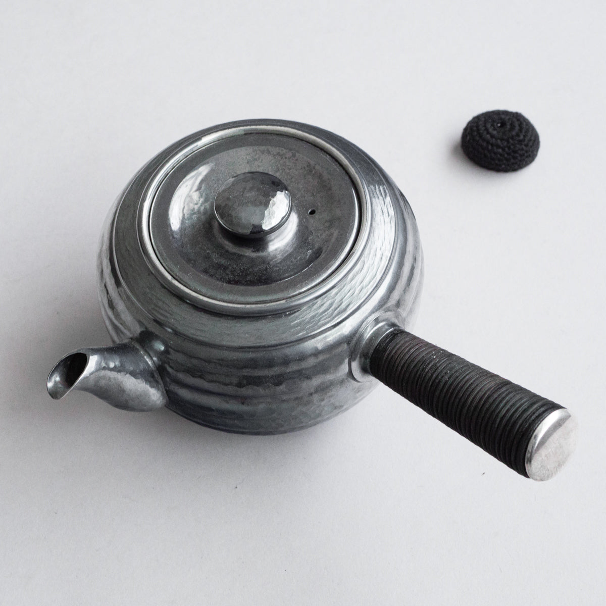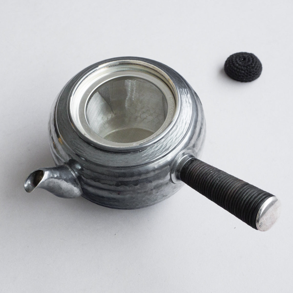 こちらは真鍮製の急須で銀メッキが施されているものです。持ち手は熱くならないように蔓を巻き付けております。装着可能な金属の茶こしアミも付属。丹精に数千回も叩き描いた槌目模様は美しさだけではなく、本体の強度を増す役割も果たしています。