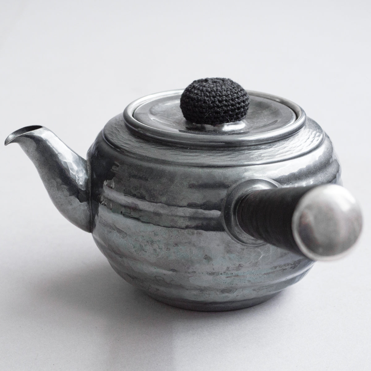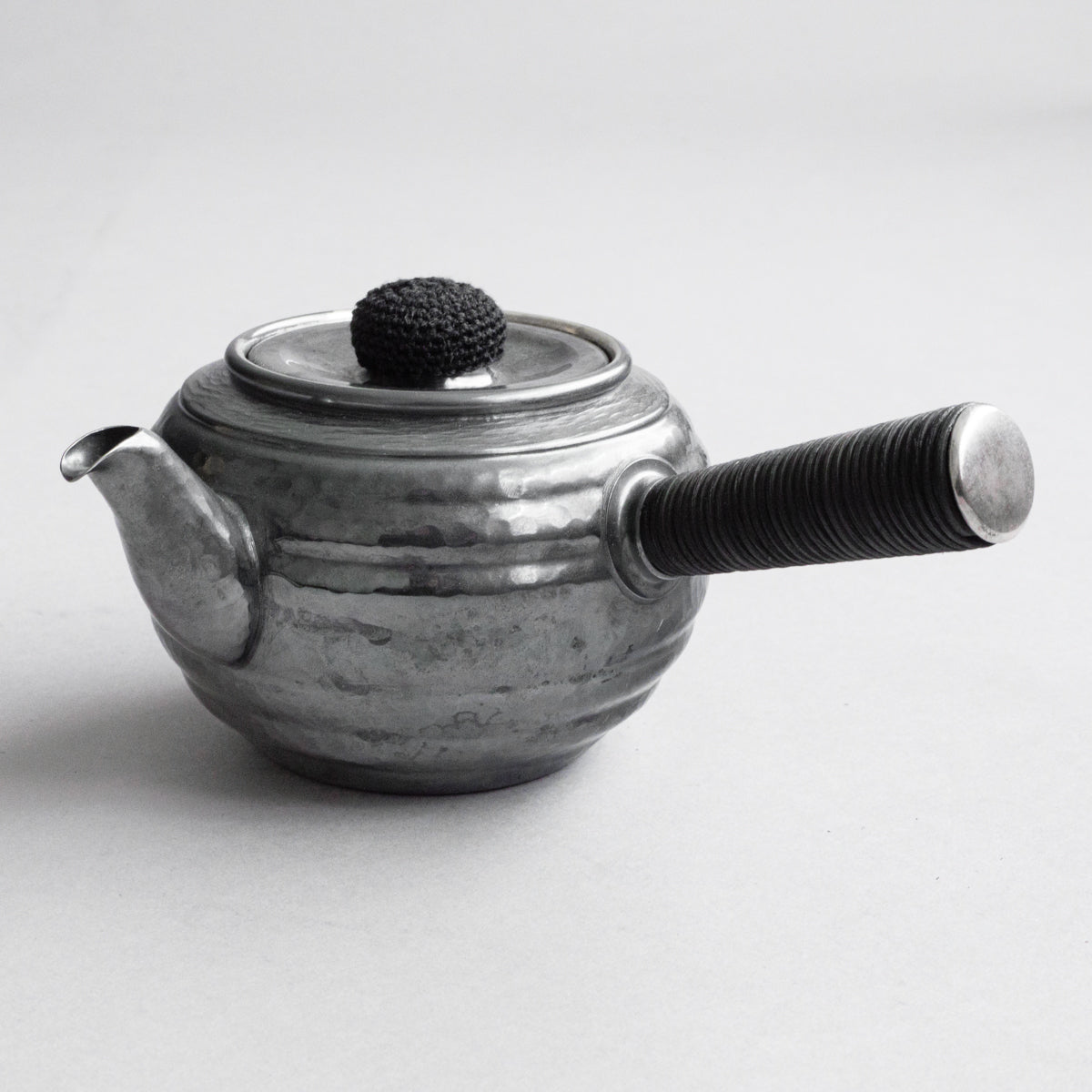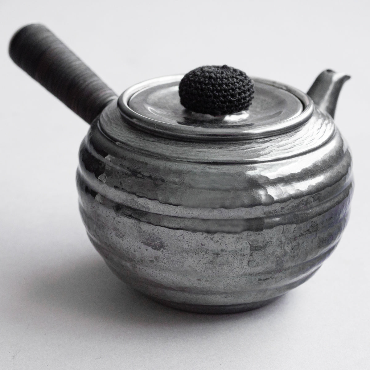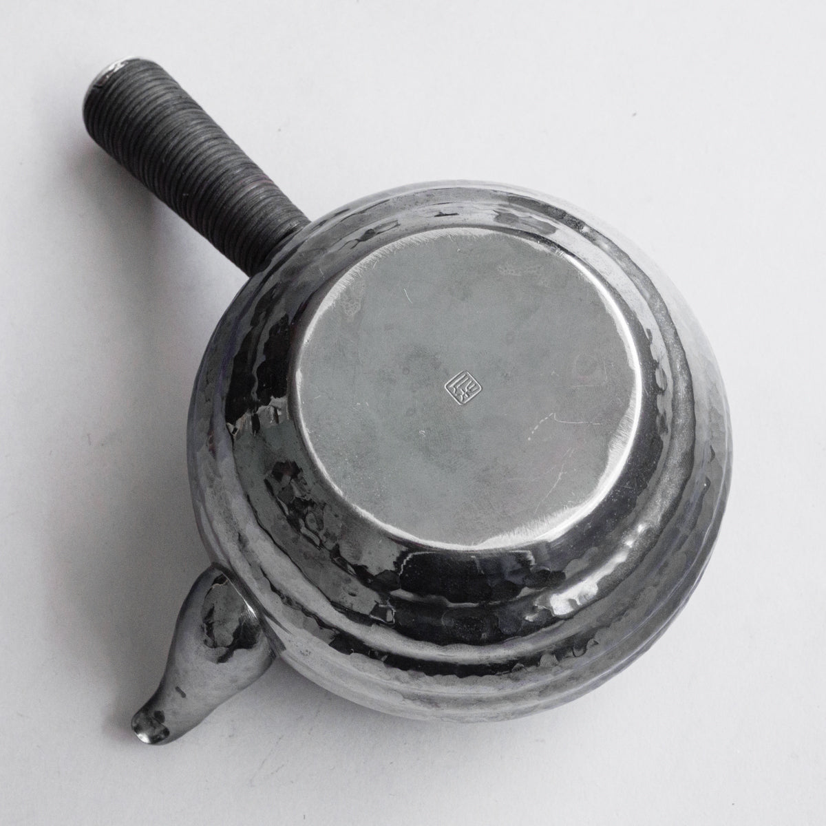 こちらは真鍮製の急須で銀メッキが施されているものです。持ち手は熱くならないように蔓を巻き付けております。装着可能な金属の茶こしアミも付属。丹精に数千回も叩き描いた槌目模様は美しさだけではなく、本体の強度を増す役割も果たしています。