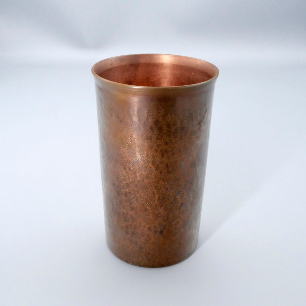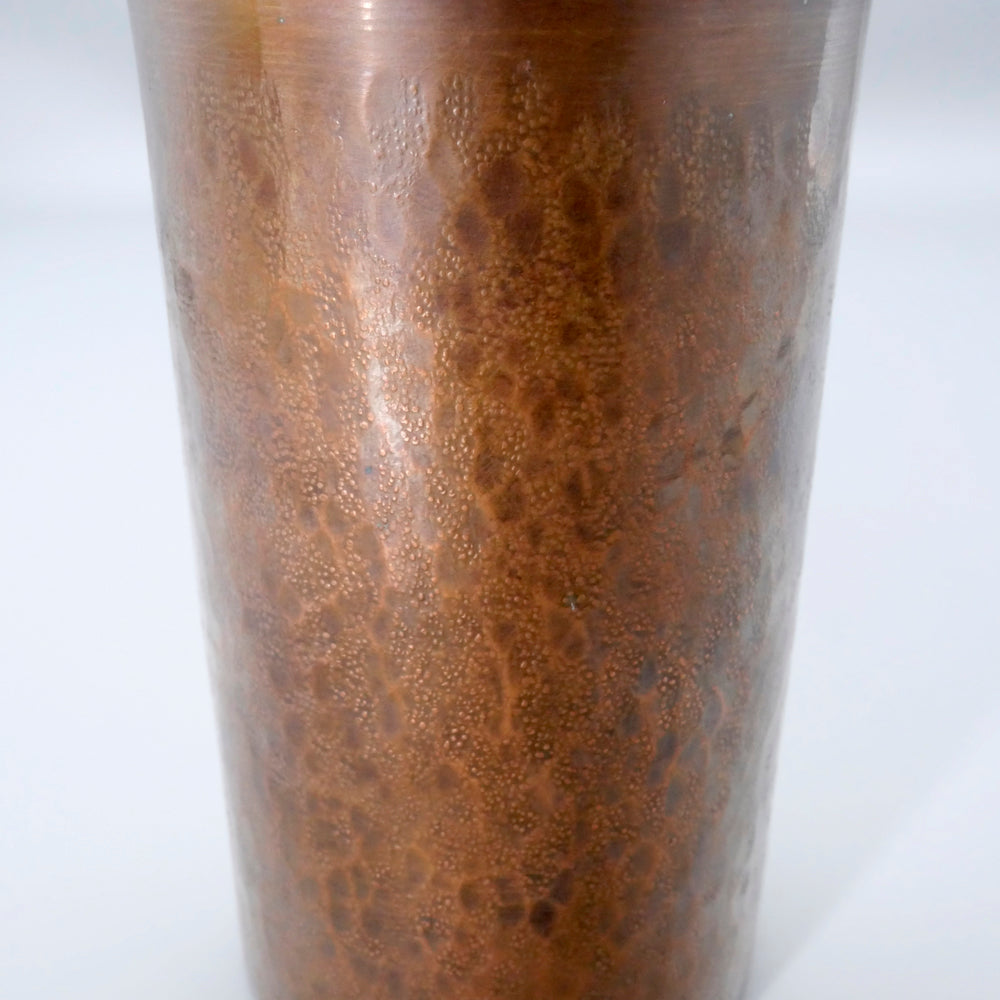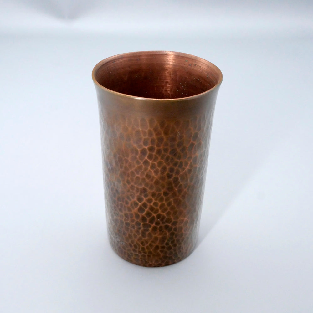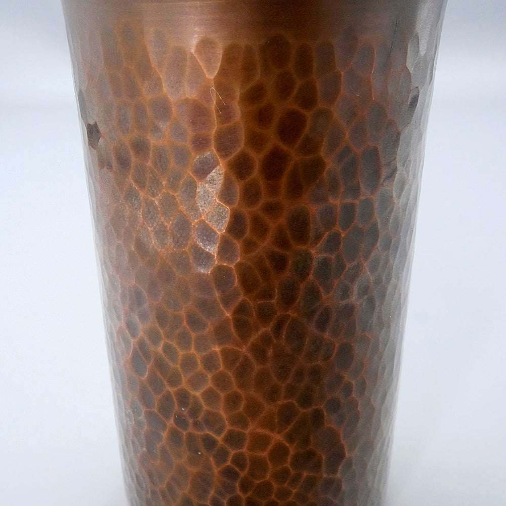 こちらは銅のビアカップで、銅は抗菌作用があるのできれいに保てます。お写真のように、それぞれ表面の鍛金模様が異なります。