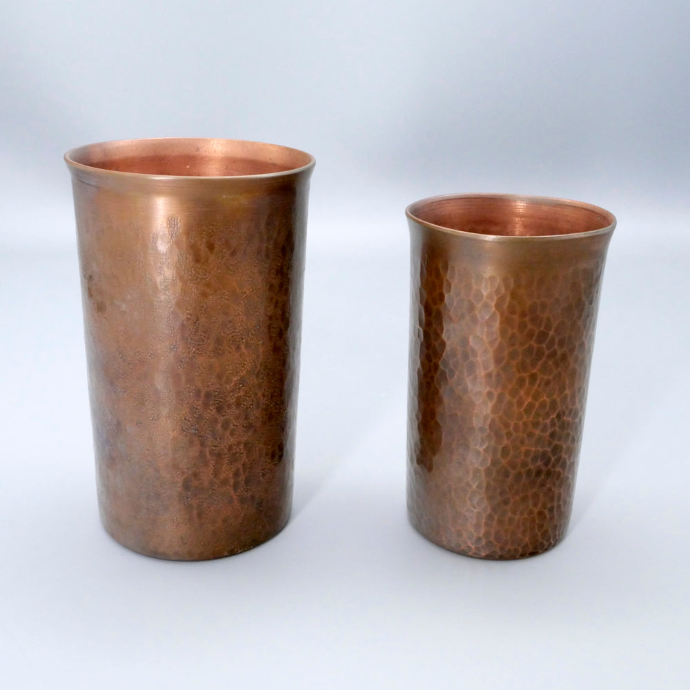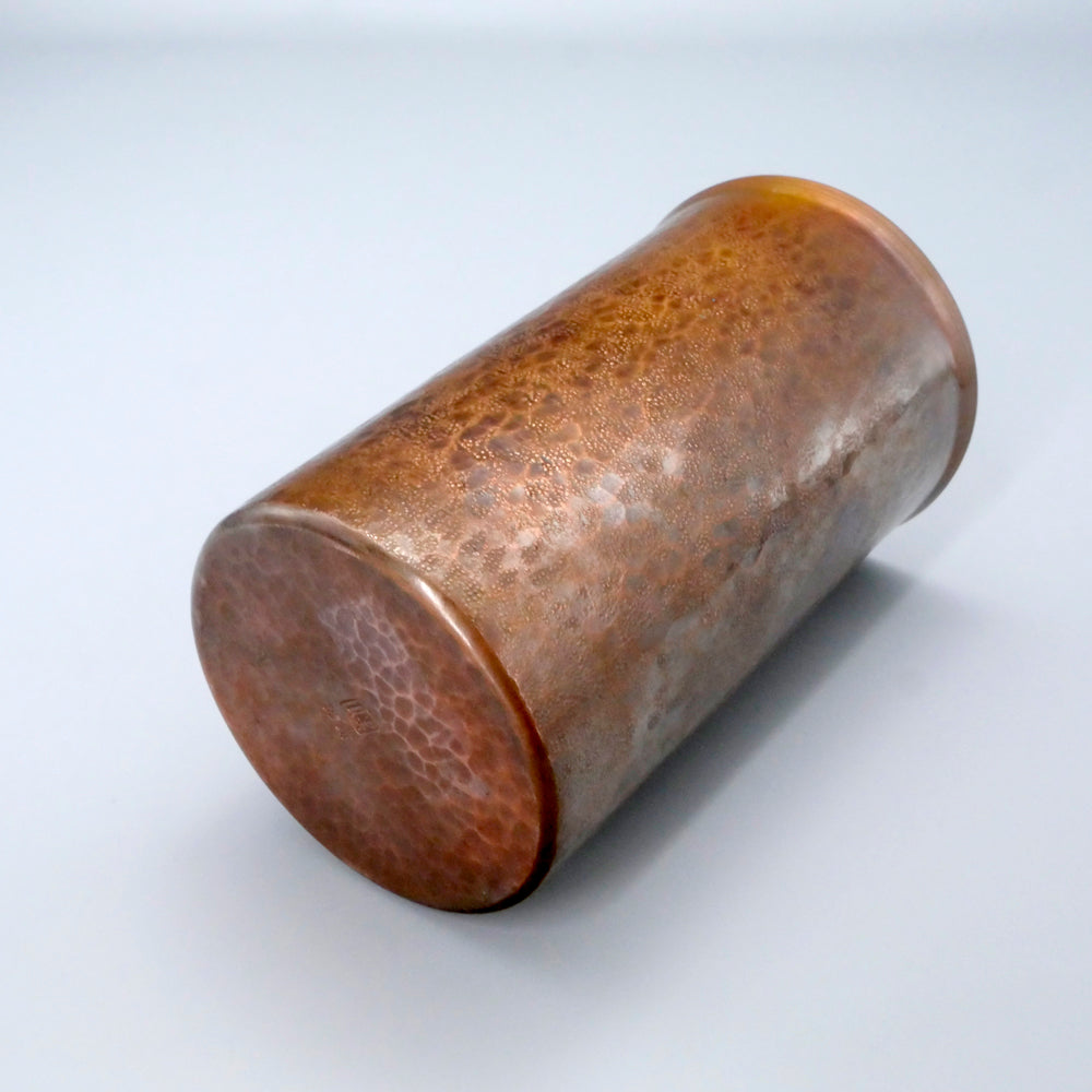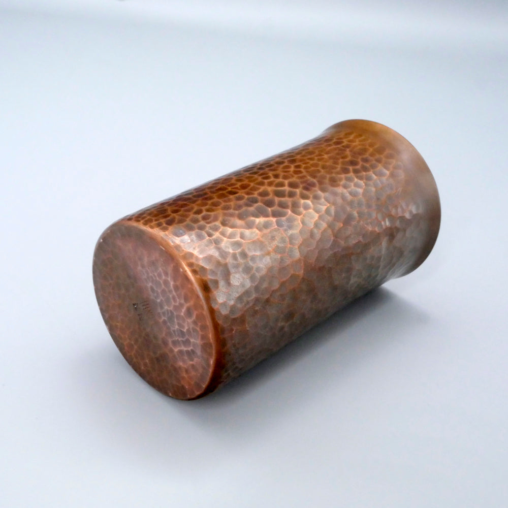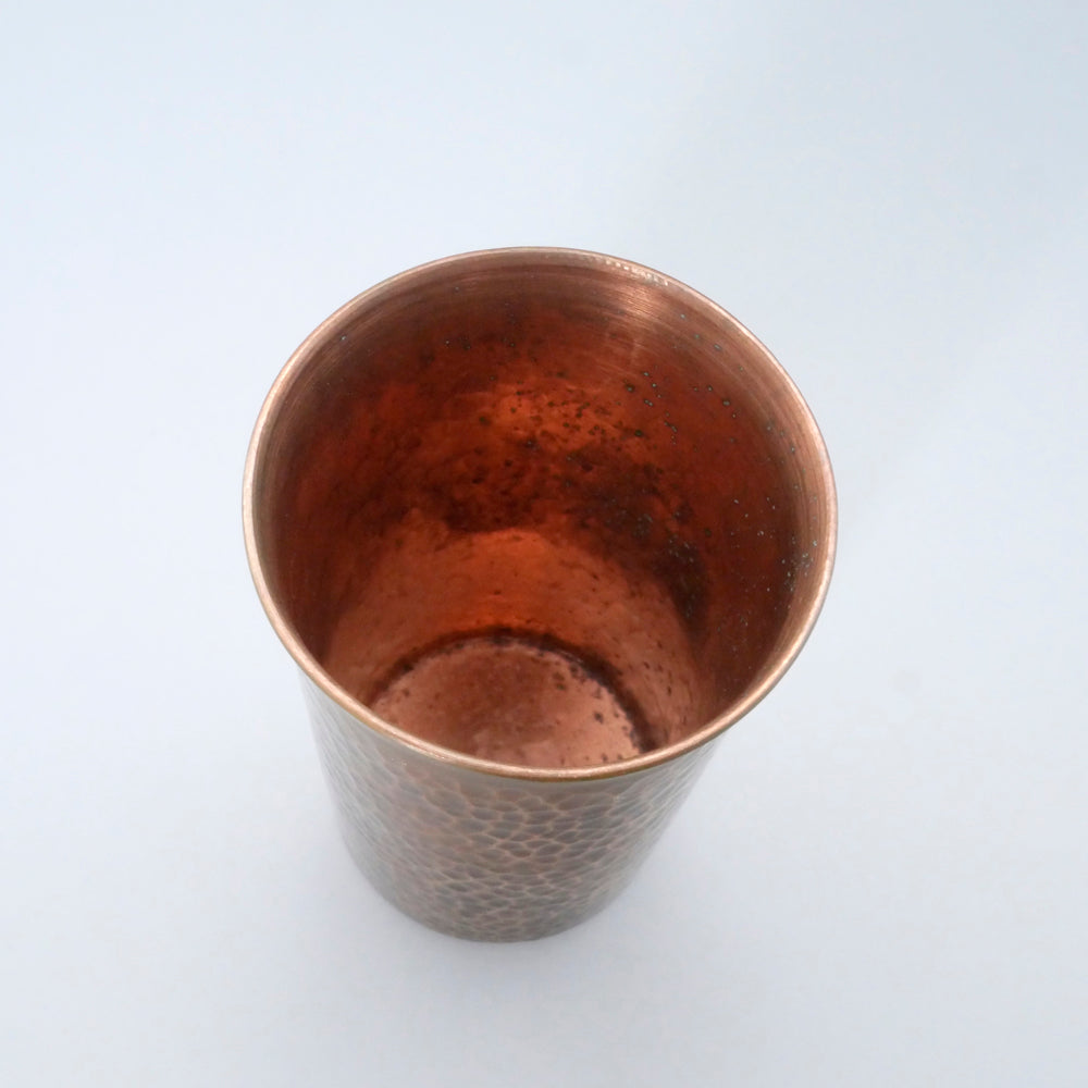 こちらは銅のビアカップで、銅は抗菌作用があるのできれいに保てます。お写真のように、それぞれ表面の鍛金模様が異なります。