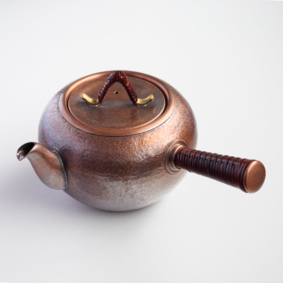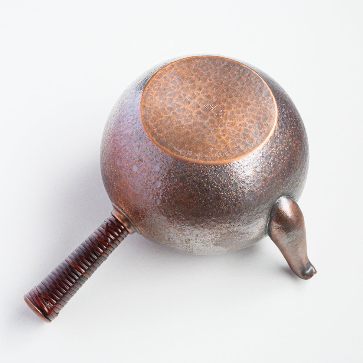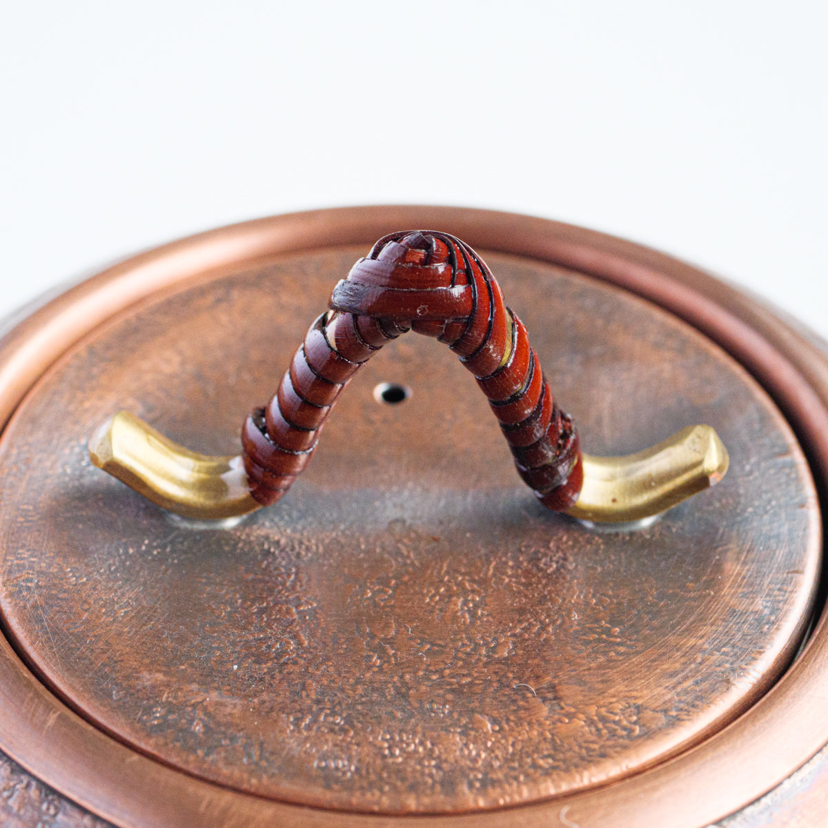 こちらは銅の急須で、持ち手は熱くならないように蔓を巻き付けております。銅は熱伝導が良いため、濃いお茶が好きな方にオススメで、さらに抗菌作用があるのでお手入れも乾拭きだけで大丈夫です。銅は経年変化も美しく、まさに一生ものの逸品です。また丹精に数千回も叩き描いた槌目模様は美しさだけではなく、本体の強度を増す役割も果たしています。