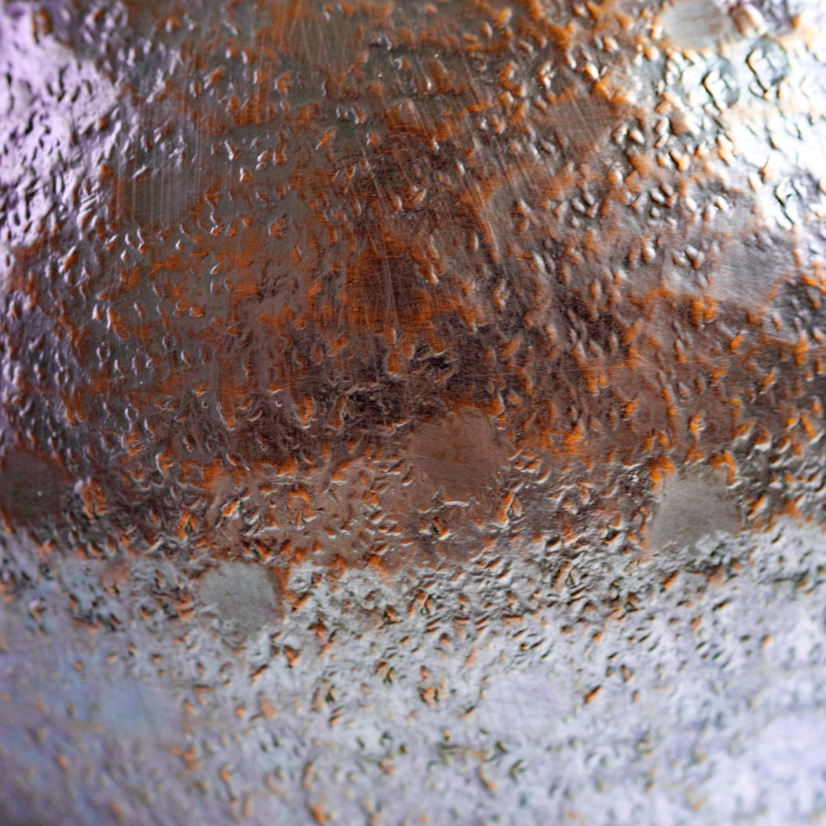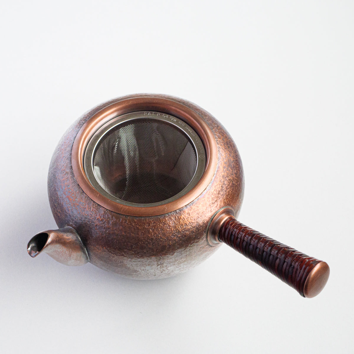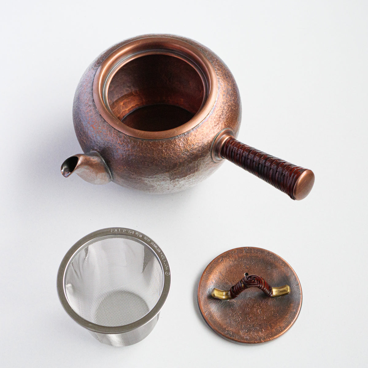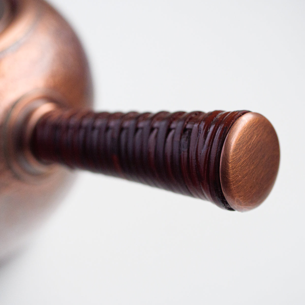 こちらは銅の急須で、持ち手は熱くならないように蔓を巻き付けております。銅は熱伝導が良いため、濃いお茶が好きな方にオススメで、さらに抗菌作用があるのでお手入れも乾拭きだけで大丈夫です。銅は経年変化も美しく、まさに一生ものの逸品です。また丹精に数千回も叩き描いた槌目模様は美しさだけではなく、本体の強度を増す役割も果たしています。
