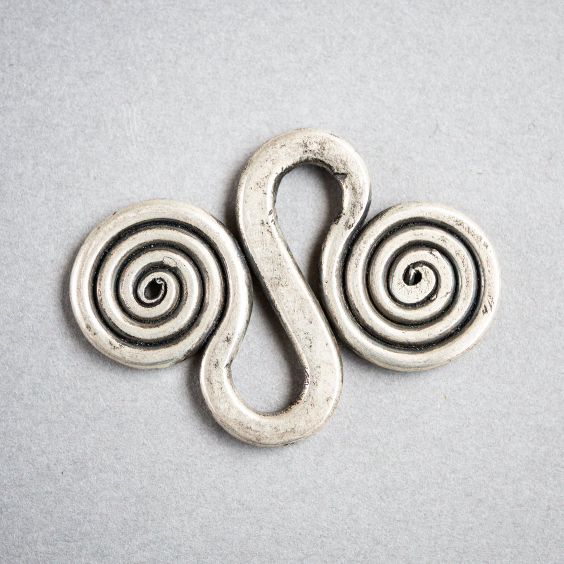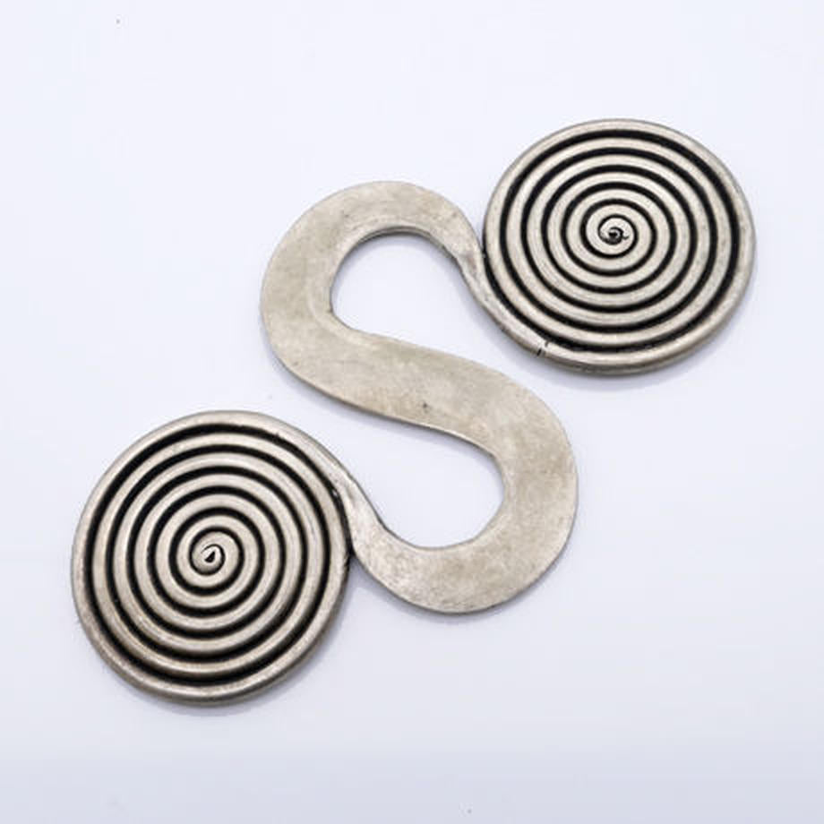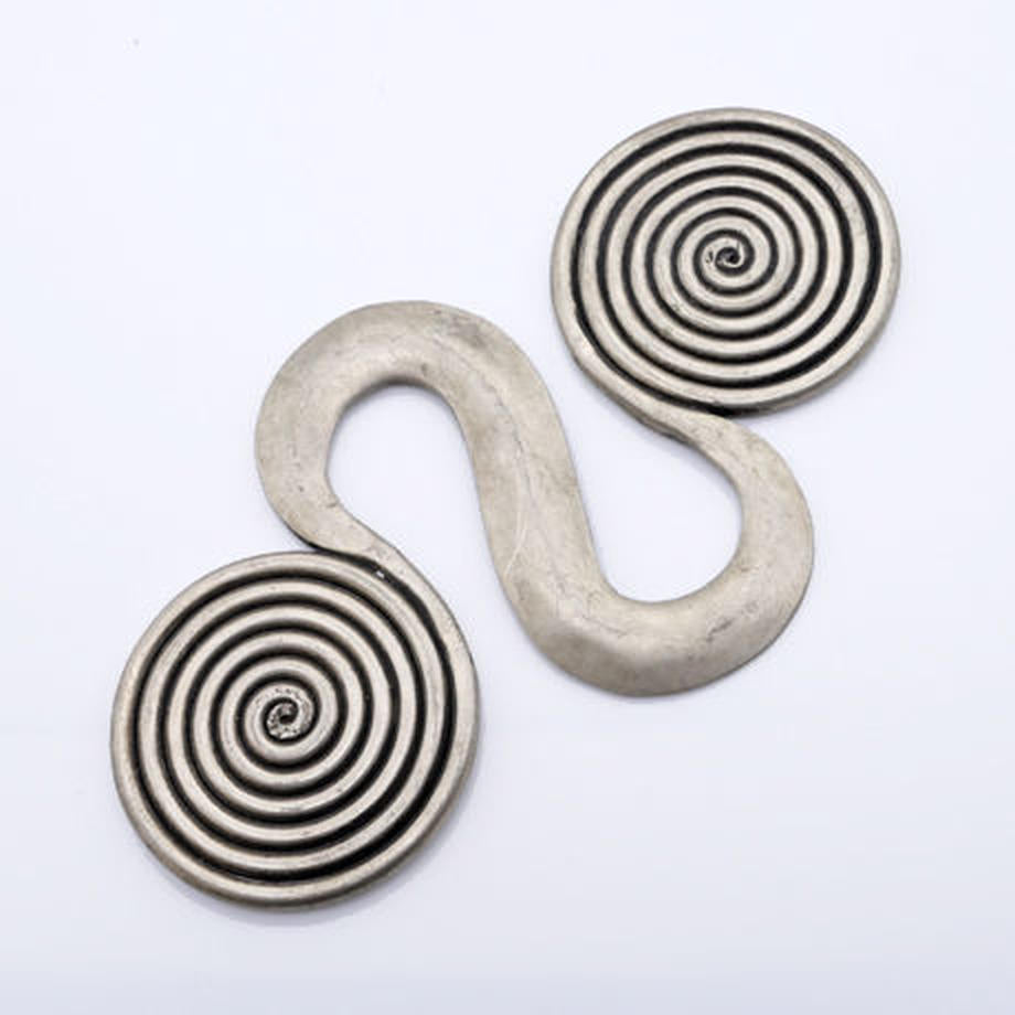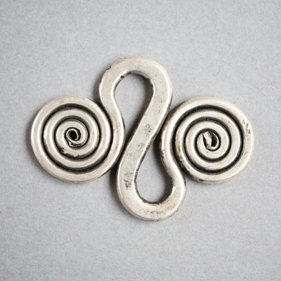 トン族の首後ろに縦にぶら下げる装飾品。渦巻は太陽のエネルギーを表現しており、魔除けとして言い伝えられています。また一説によると昆虫の目を表しており、やはり魔除けの意味がございます。銀板を見事なまでに成型した逸品で、巨大なLサイズとミニサイズのSサイズがございます。