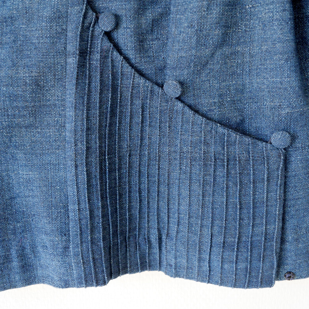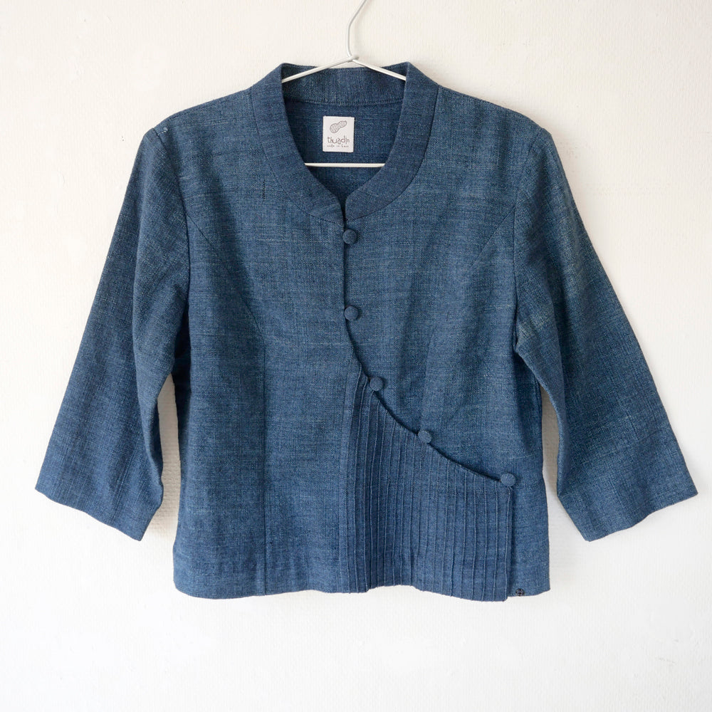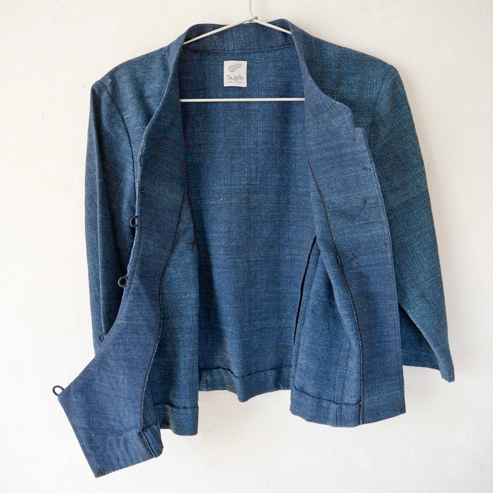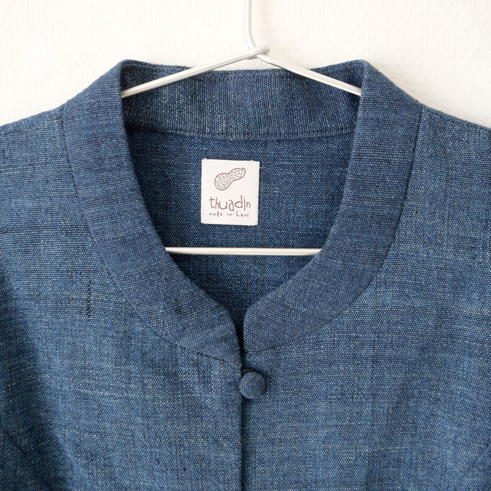 ラオス現地で物作りをするユニット[thuadin]によるトップス。藍染色の手紡ぎ手織りの質感がたっぷりのコットンジャケット。空気をたくさんはらんだ、ふんわりと柔らかいお肌に優しい生地が心地よいです。5箇所をボタンでとめ、さらにお写真にあるように隙間を埋める1つの隠しボタンがございます。