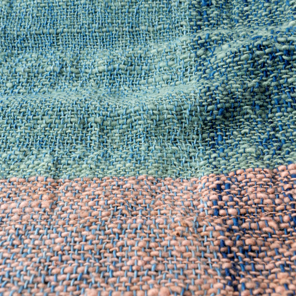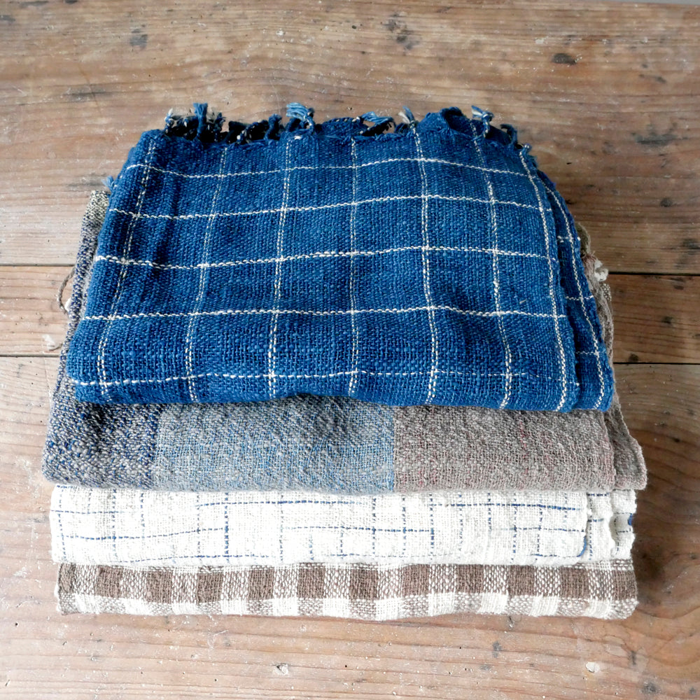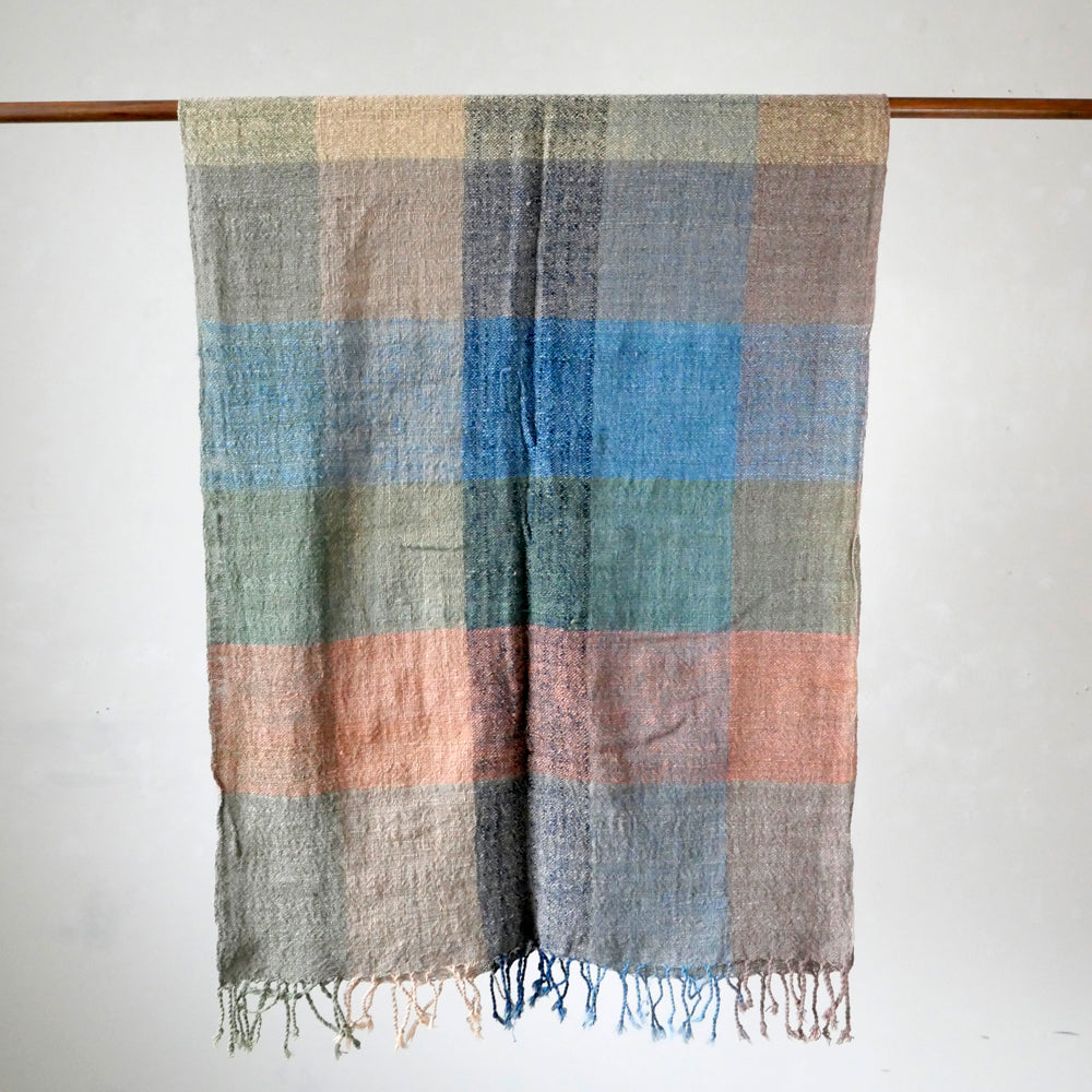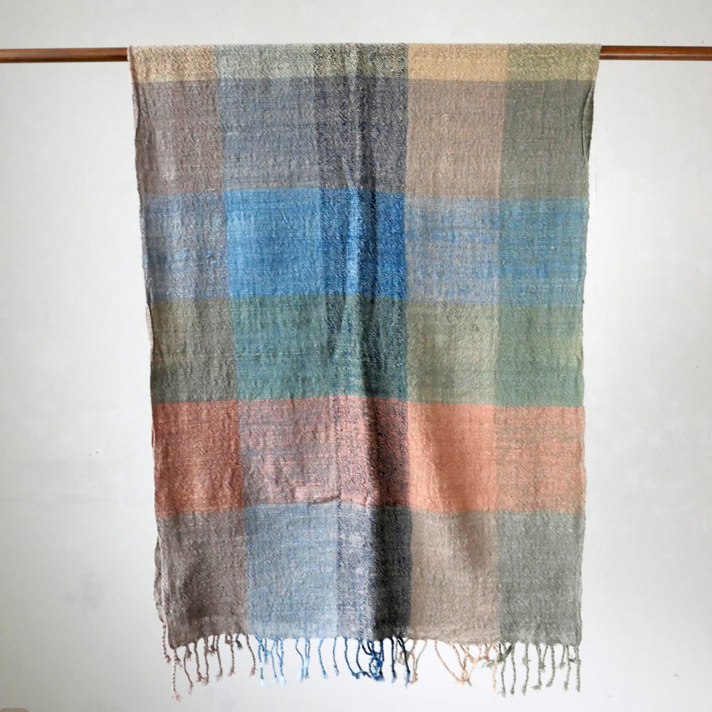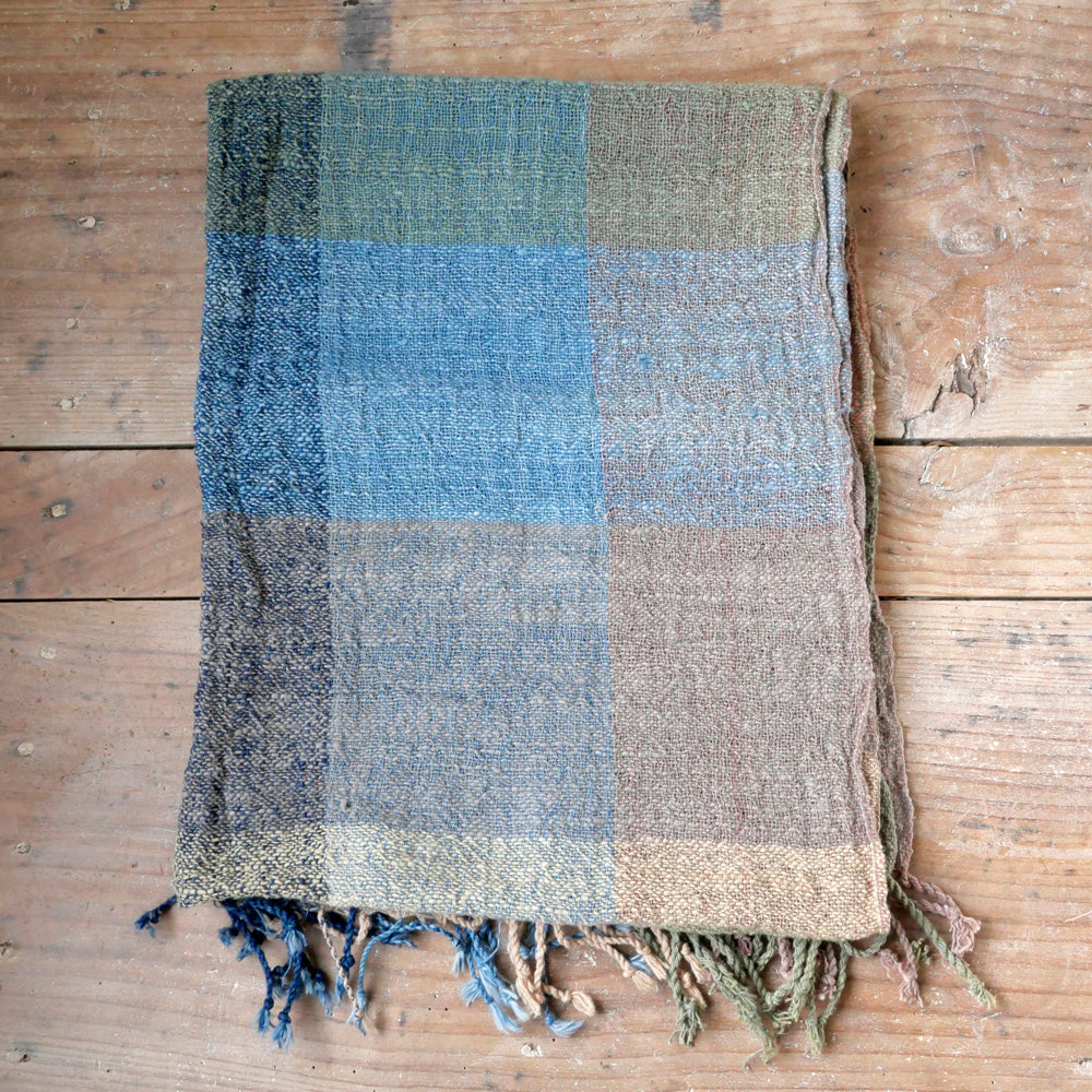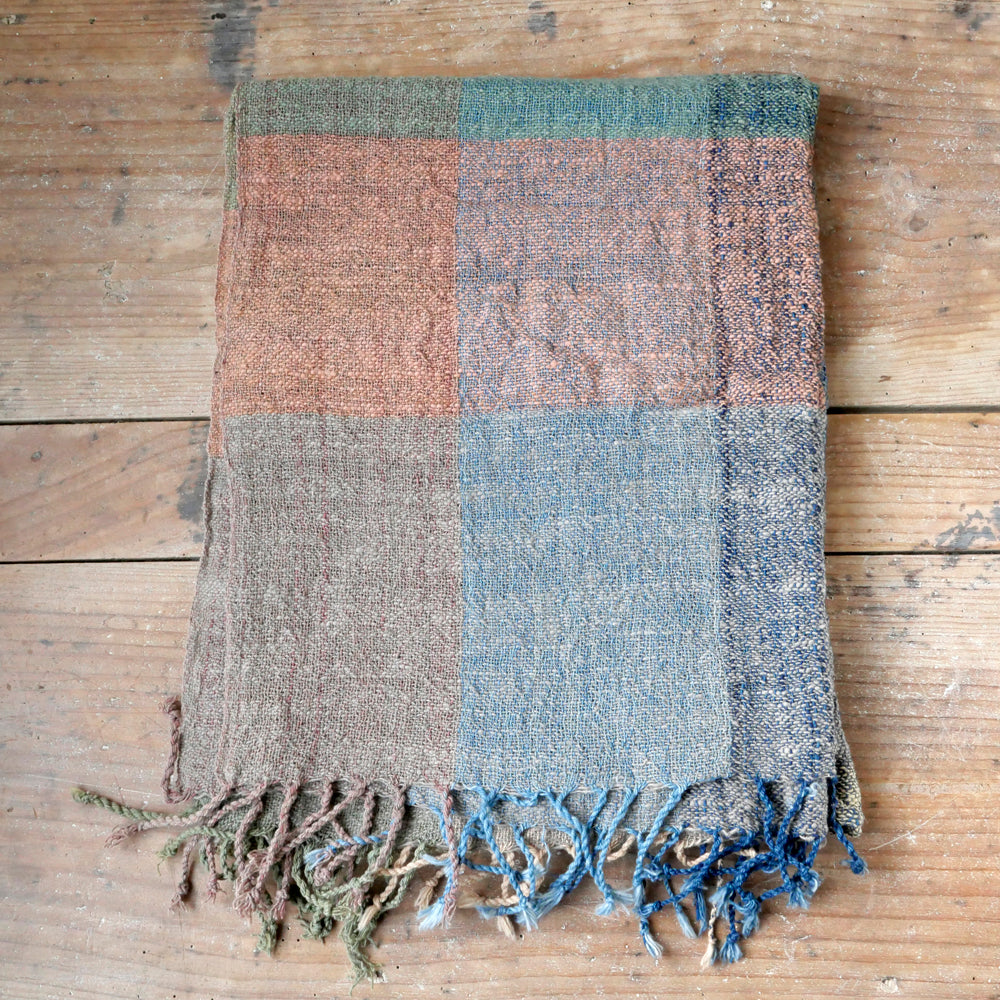 綿花から手紡ぎで糸を作り、草木染めを施し手織りされた完全に天然人力のストール。端のフリンジも手で結んであります。空気をたくさんはらんでいるので、使用するたびにふかふかになります。綿100%なので、通年お使い頂けるストールで、こちらは大判サイズのものになります。