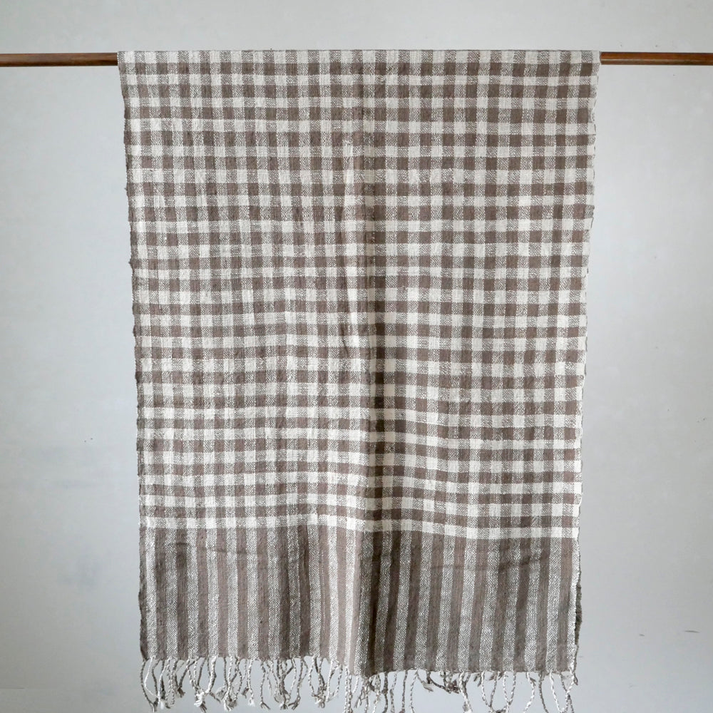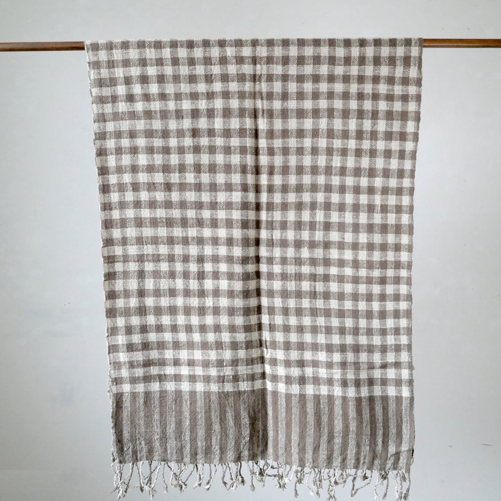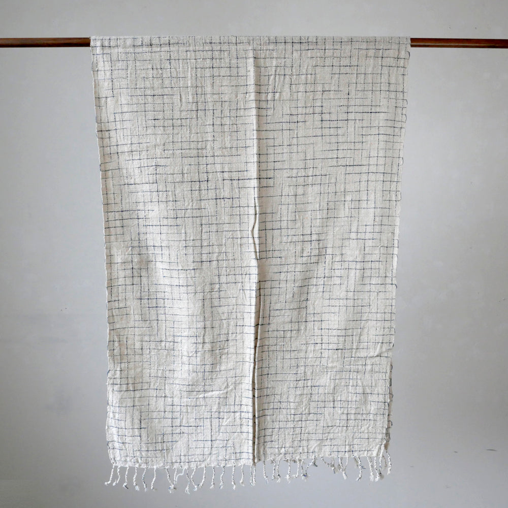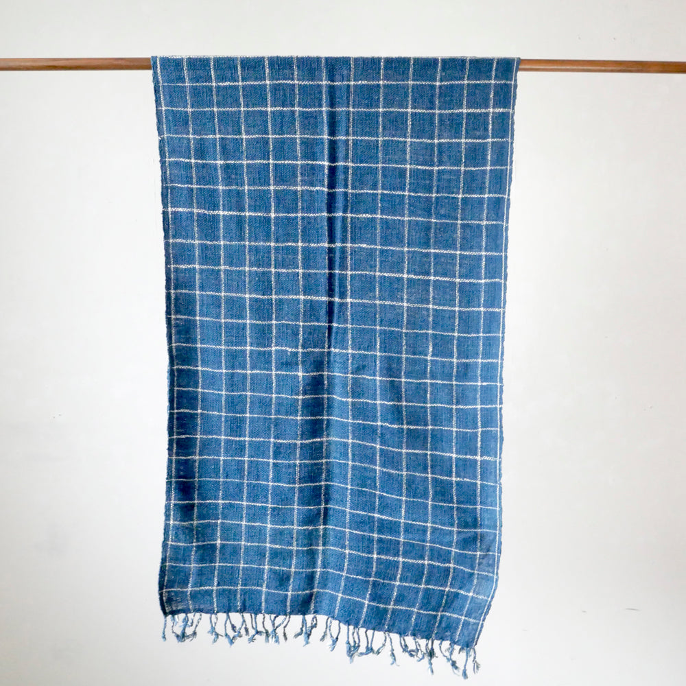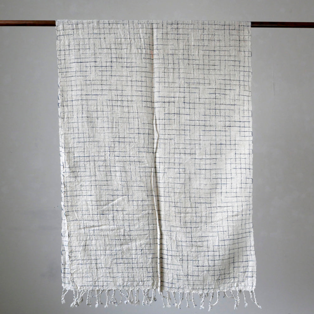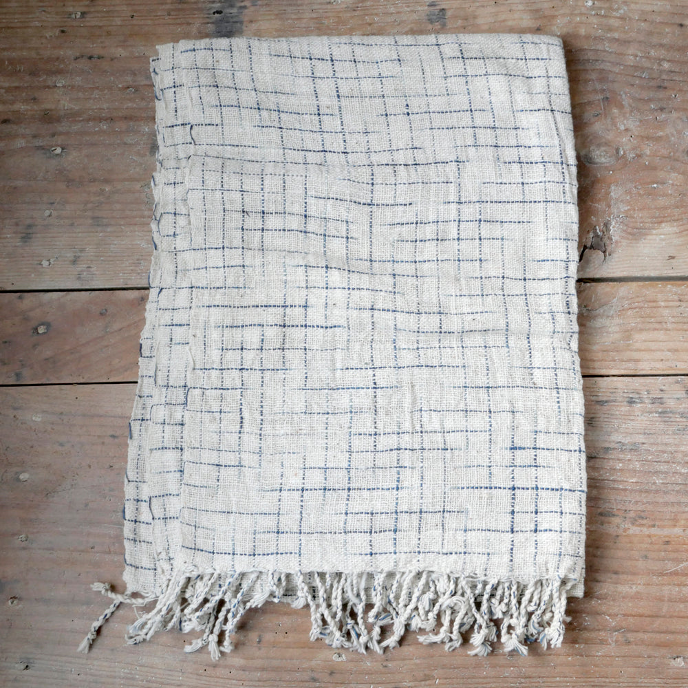 綿花から手紡ぎで糸を作り、草木染めを施し手織りされた完全に天然人力のストール。端のフリンジも手で結んであります。空気をたくさんはらんでいるので、使用するたびにふかふかになります。綿100%なので、通年お使い頂けるストールで、こちらは大判サイズのものになります。