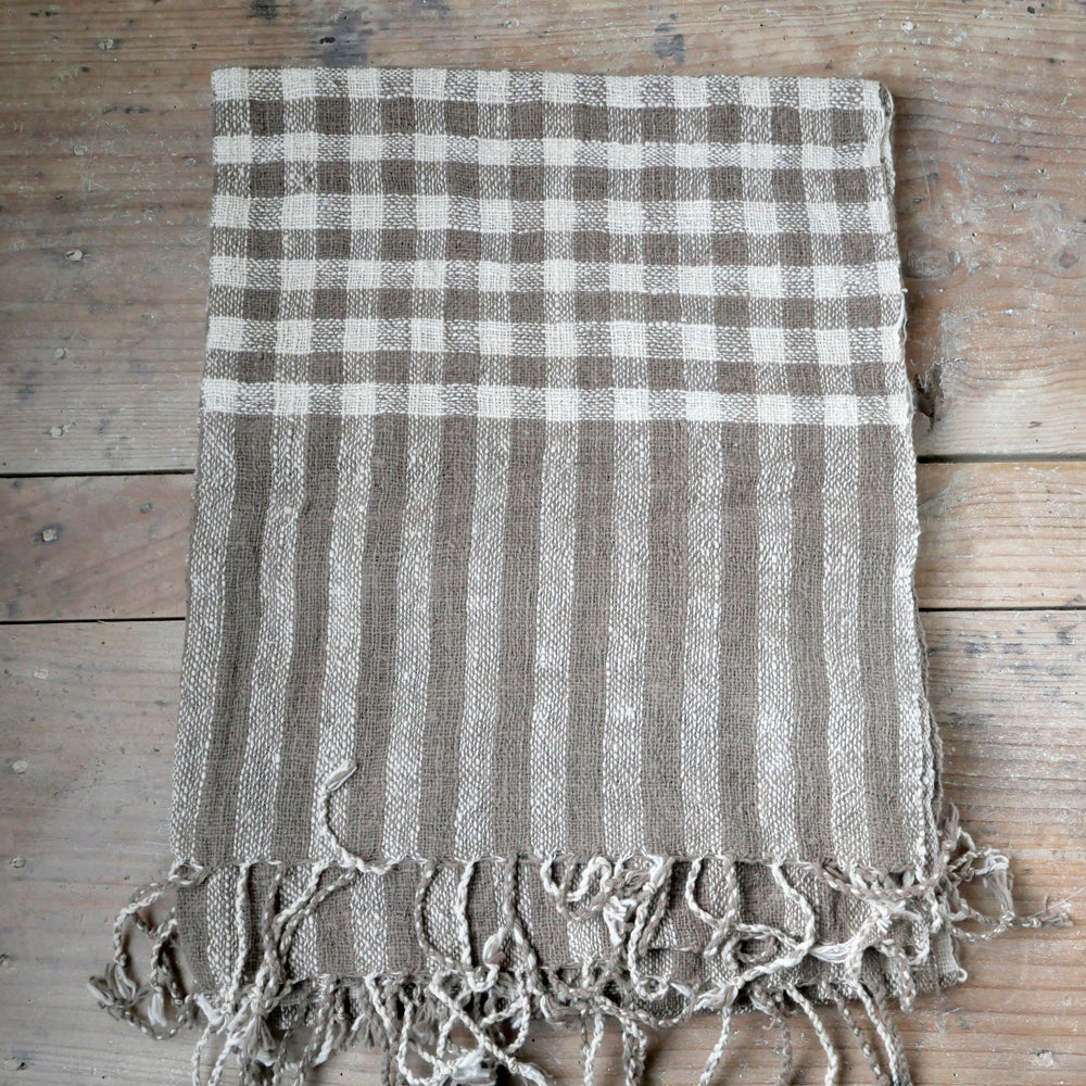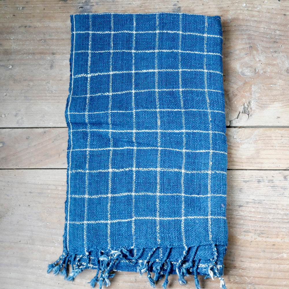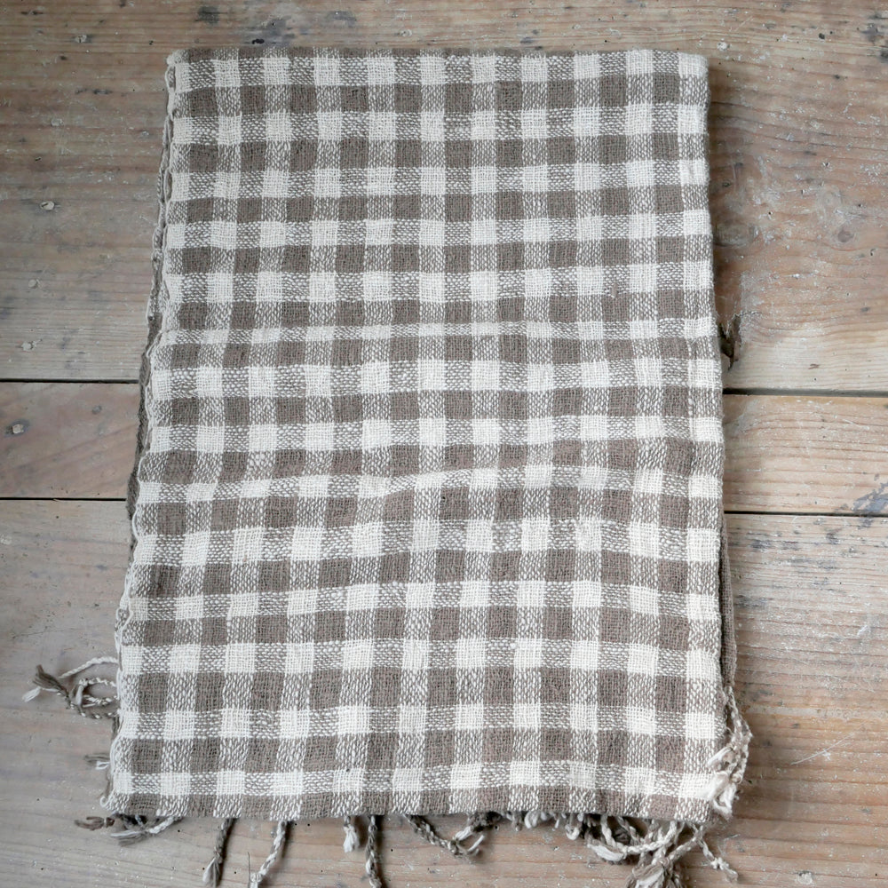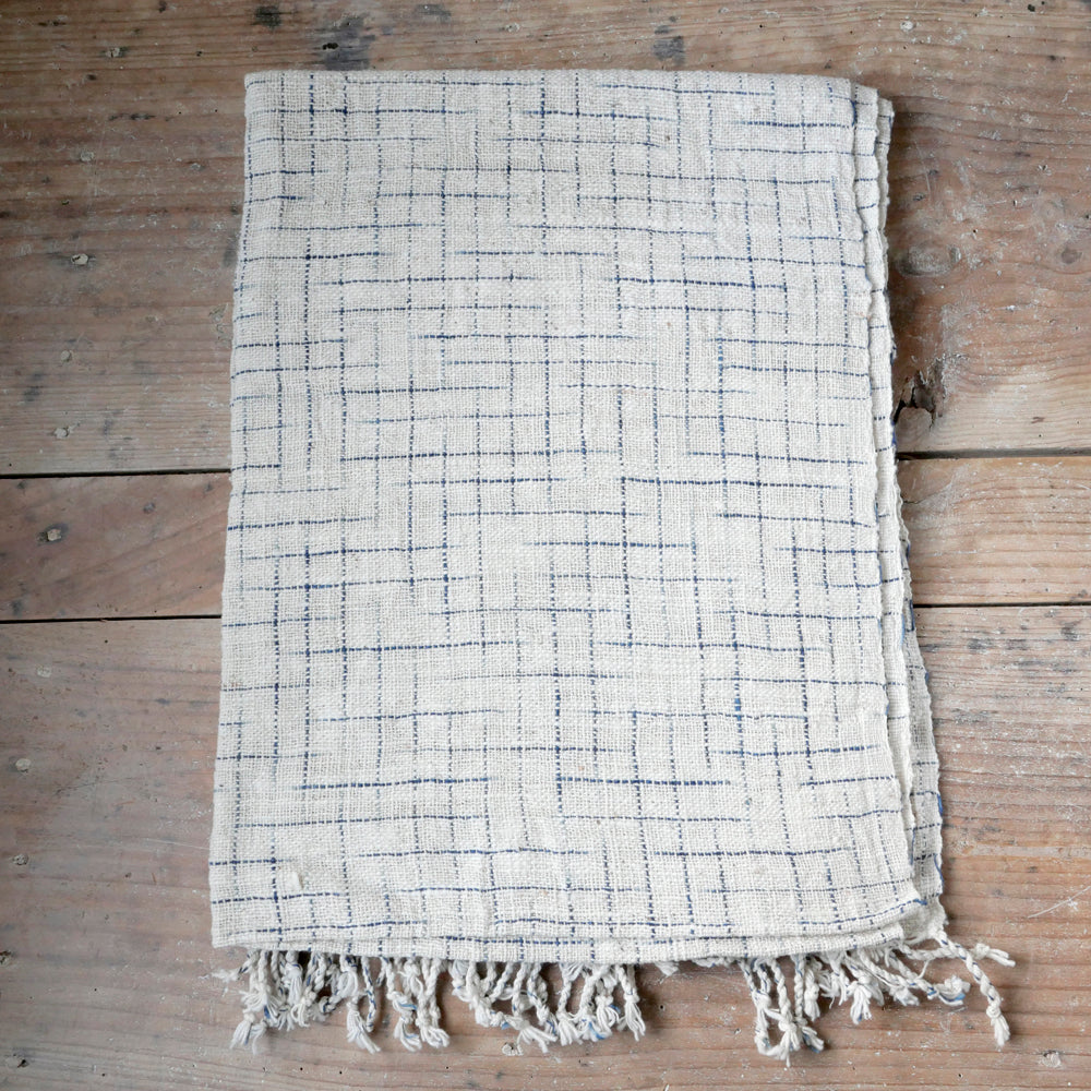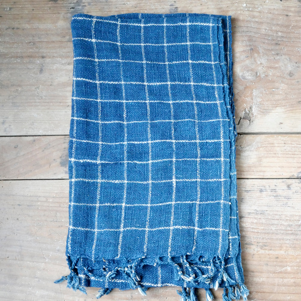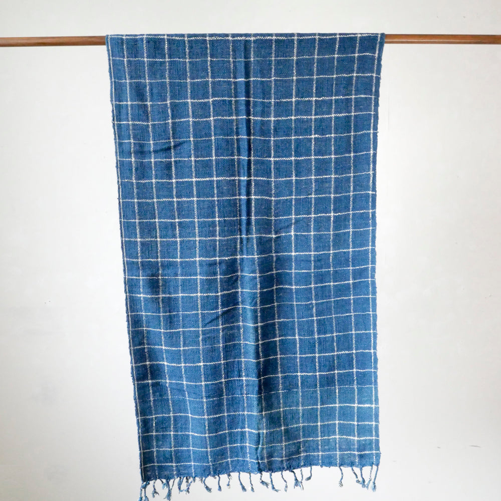綿花から手紡ぎで糸を作り、草木染めを施し手織りされた完全に天然人力のストール。端のフリンジも手で結んであります。空気をたくさんはらんでいるので、使用するたびにふかふかになります。綿100%なので、通年お使い頂けるストールで、こちらは大判サイズのものになります。